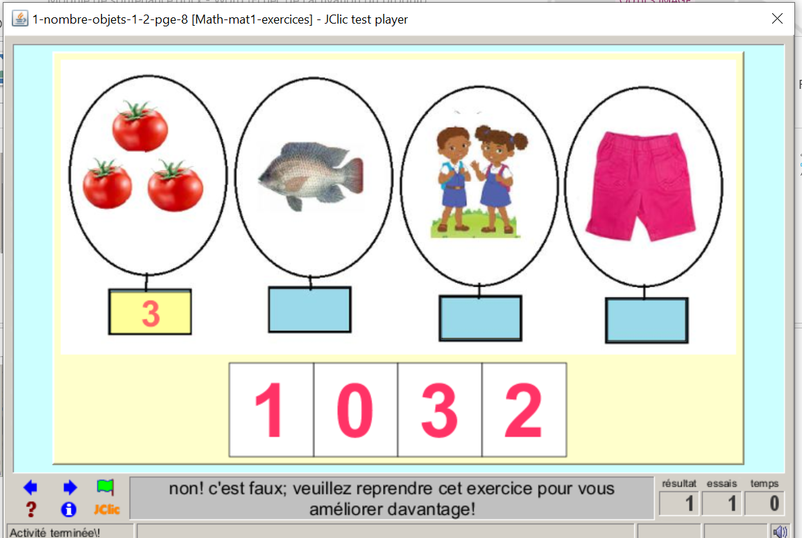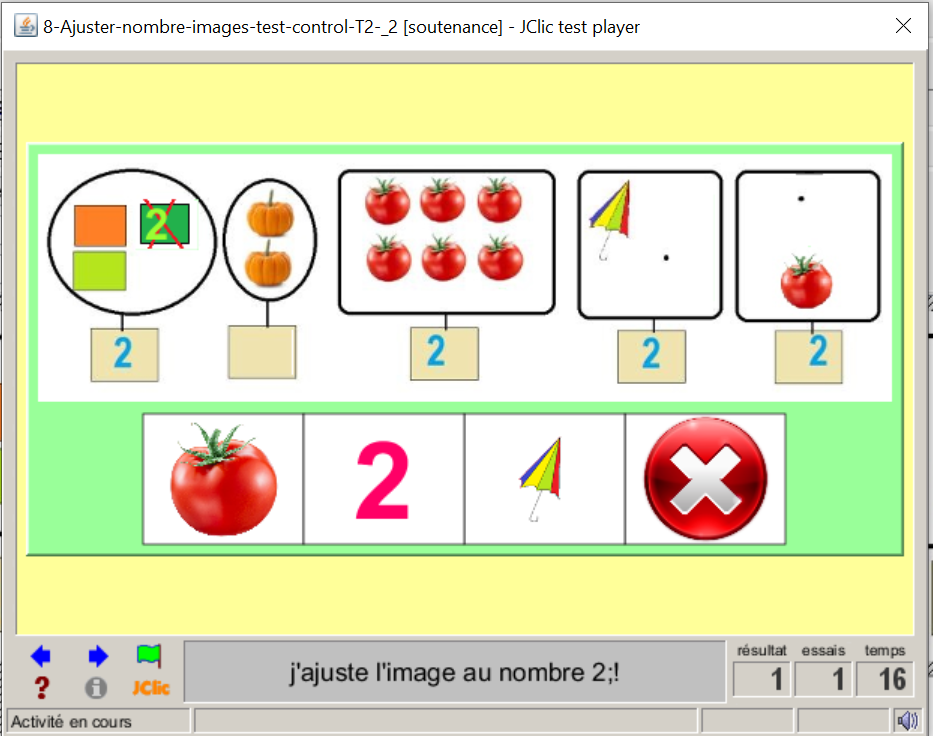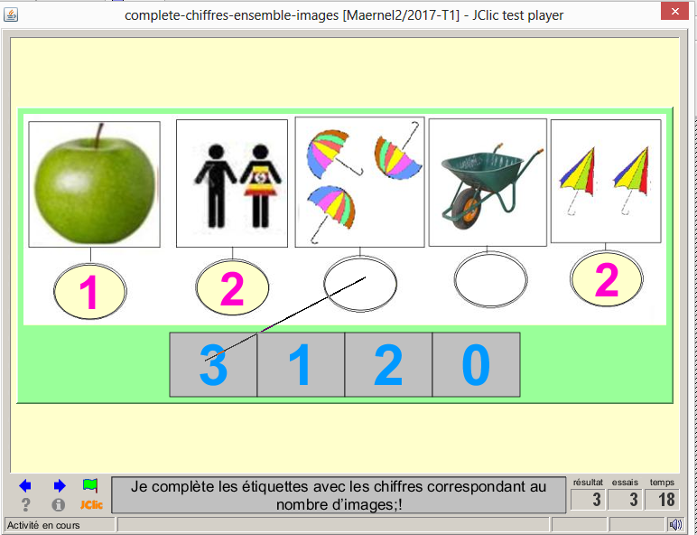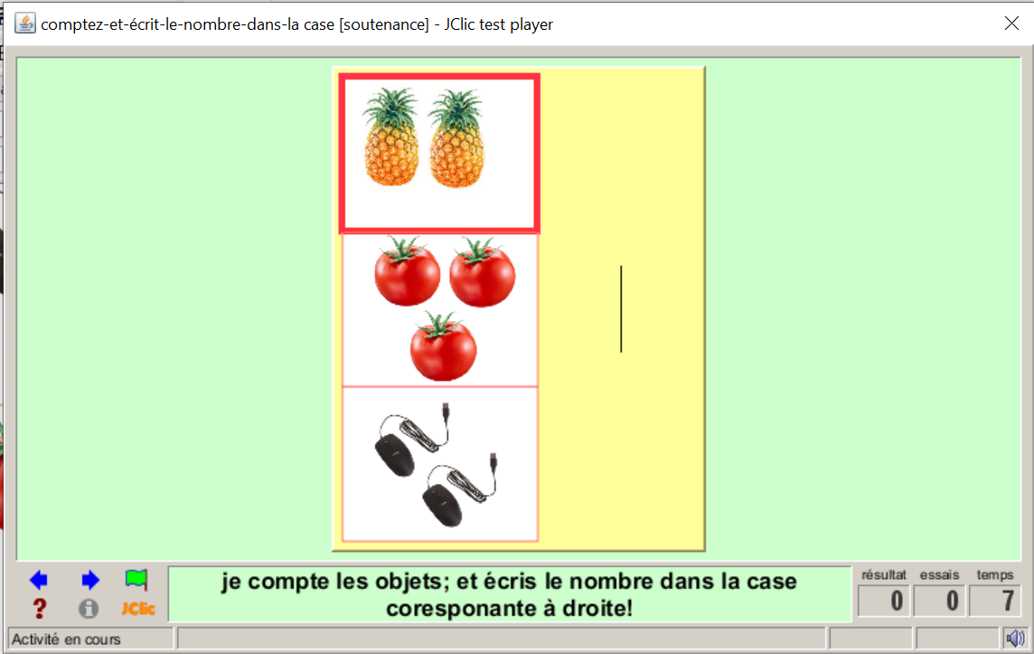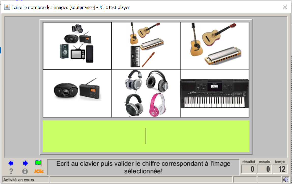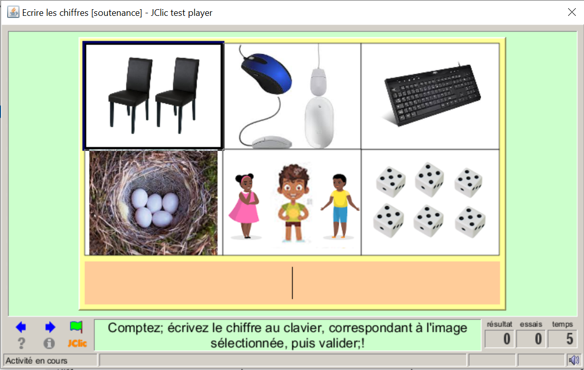 Consigne textuel et sonore : « Comptez; écrivez le chiffre au clavier, correspondant à l'image sélectionnée, puis valider;! »