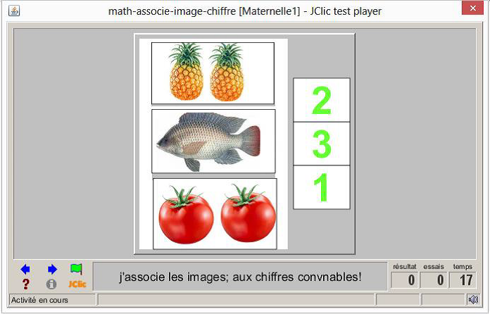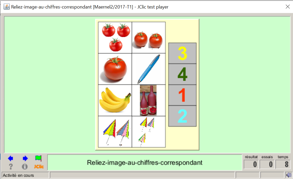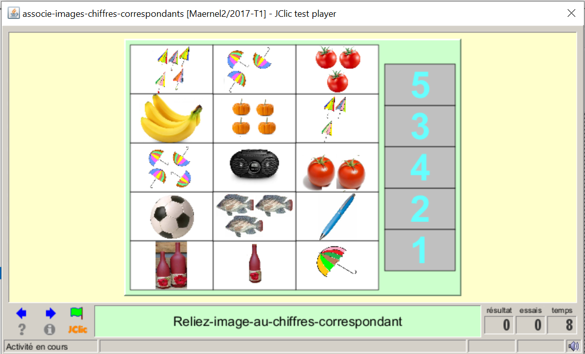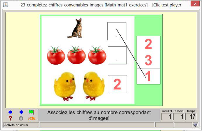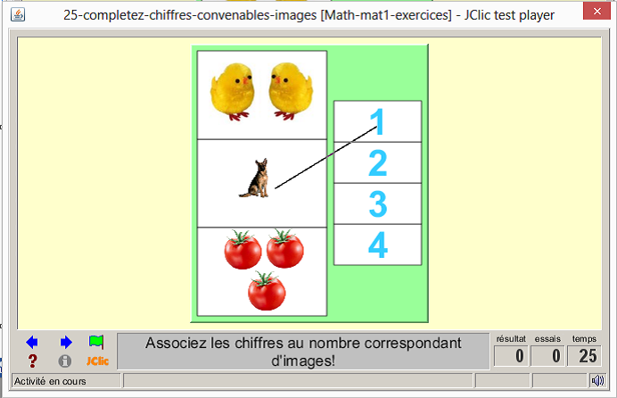 Consigne textuel et sonore : « j’ajuste en reliant les images au nombre correspondant à partir de deux grilles »