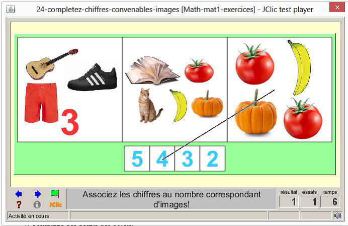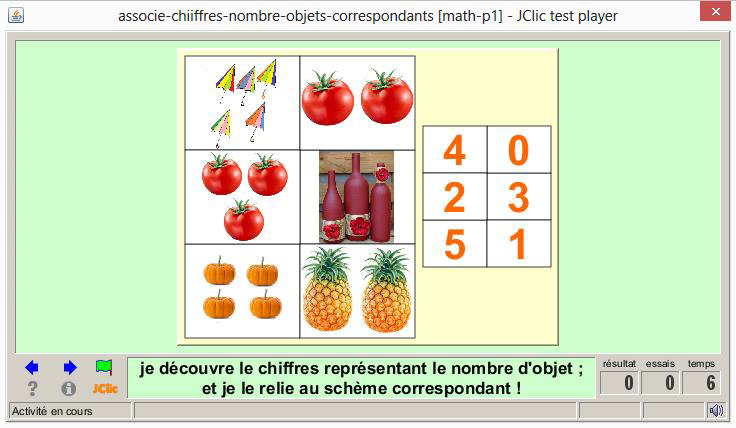 consigne textuel et sonore: « Je découvre les chiffres représentant les objets et je les relie au schème correspondant »
