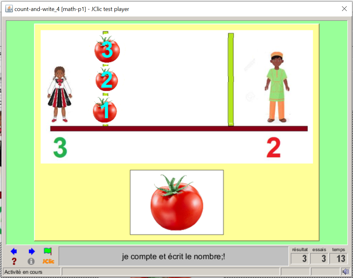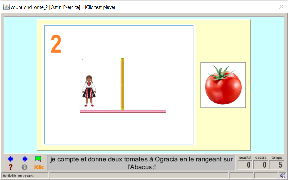 Consigne textuel et sonre : « je compte et donne deux tomates à Ogracia en le rangeant sur l’Abaque;! »