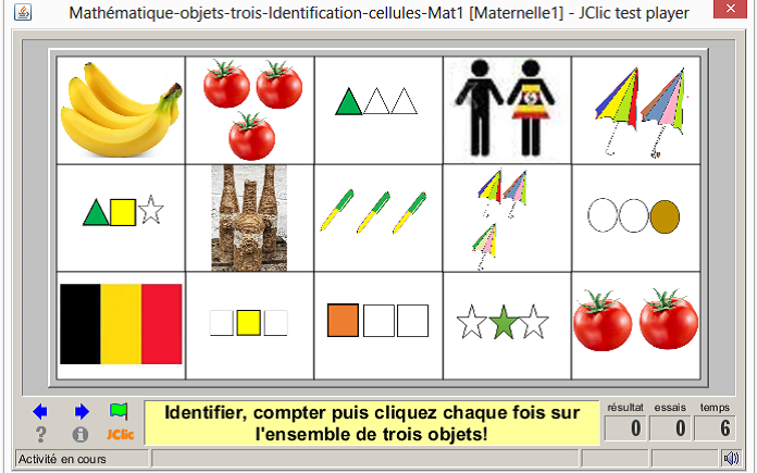 consigne textuel et sonore: Identifier puis cliquer chafois sur l'ensemble de trois objets