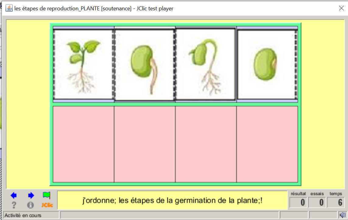 1- 1-Consigne textuel et sonore : « j'ordonne; les étapes de la germination de la plante;! »