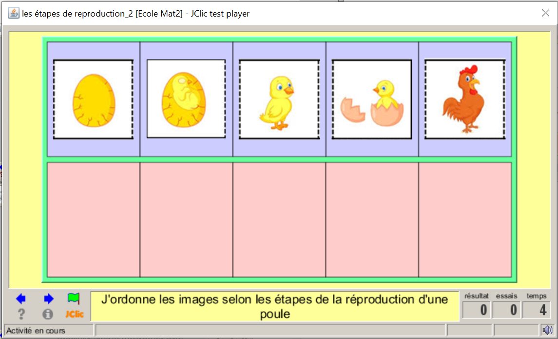 3-Consigne textuel et sonore : « 3- « J’ordonne les images selon les étapes de reproduction d’une poule »