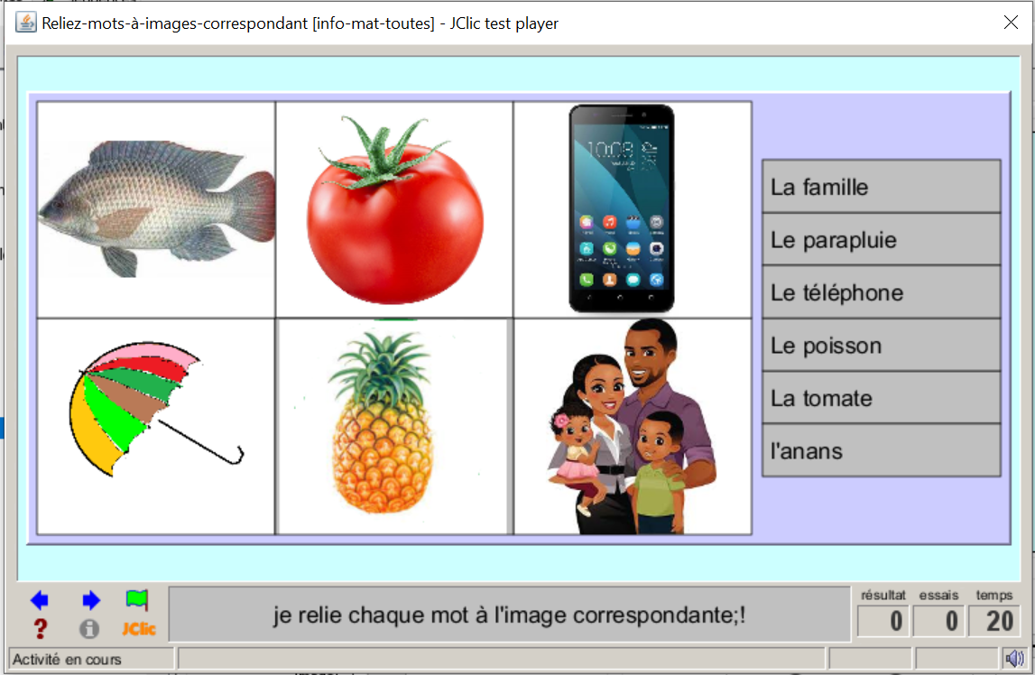 Consigne textuel et sonore : « je relie chaque mot à l'image correspondant! »