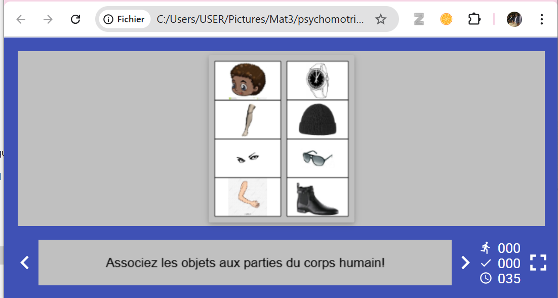Jouer en ligne. p style="color:black;border-style: bold;"> Parties du corps humain: Consigne « Associez les objets aux parties du corps humain »