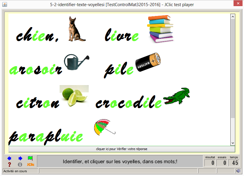 Identifier, et cliquer sur les voyelles, dans ces mots;