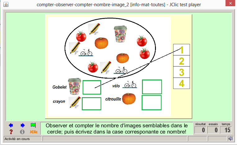 «Observer et compter le nombre d'images semblables dans le cercle; puis associez dans la case correspondante ce nombre!»